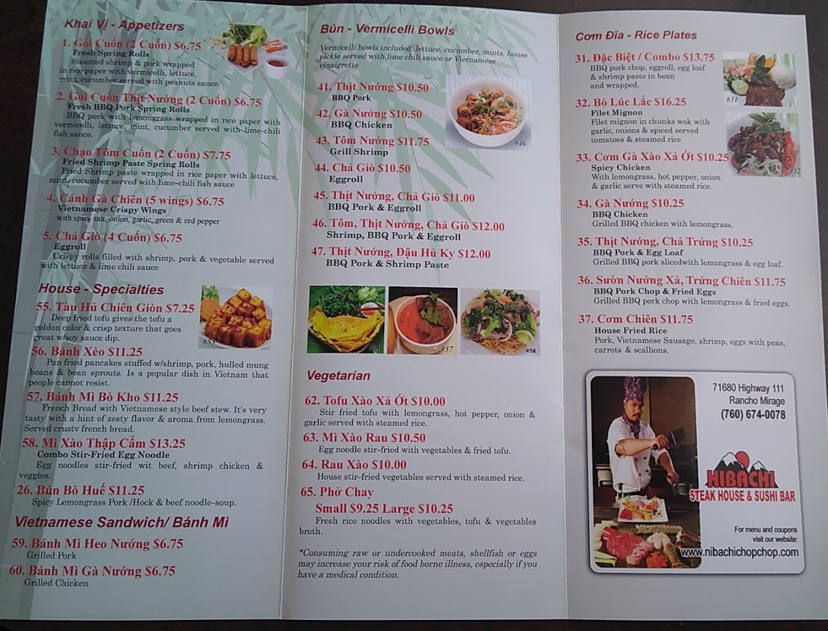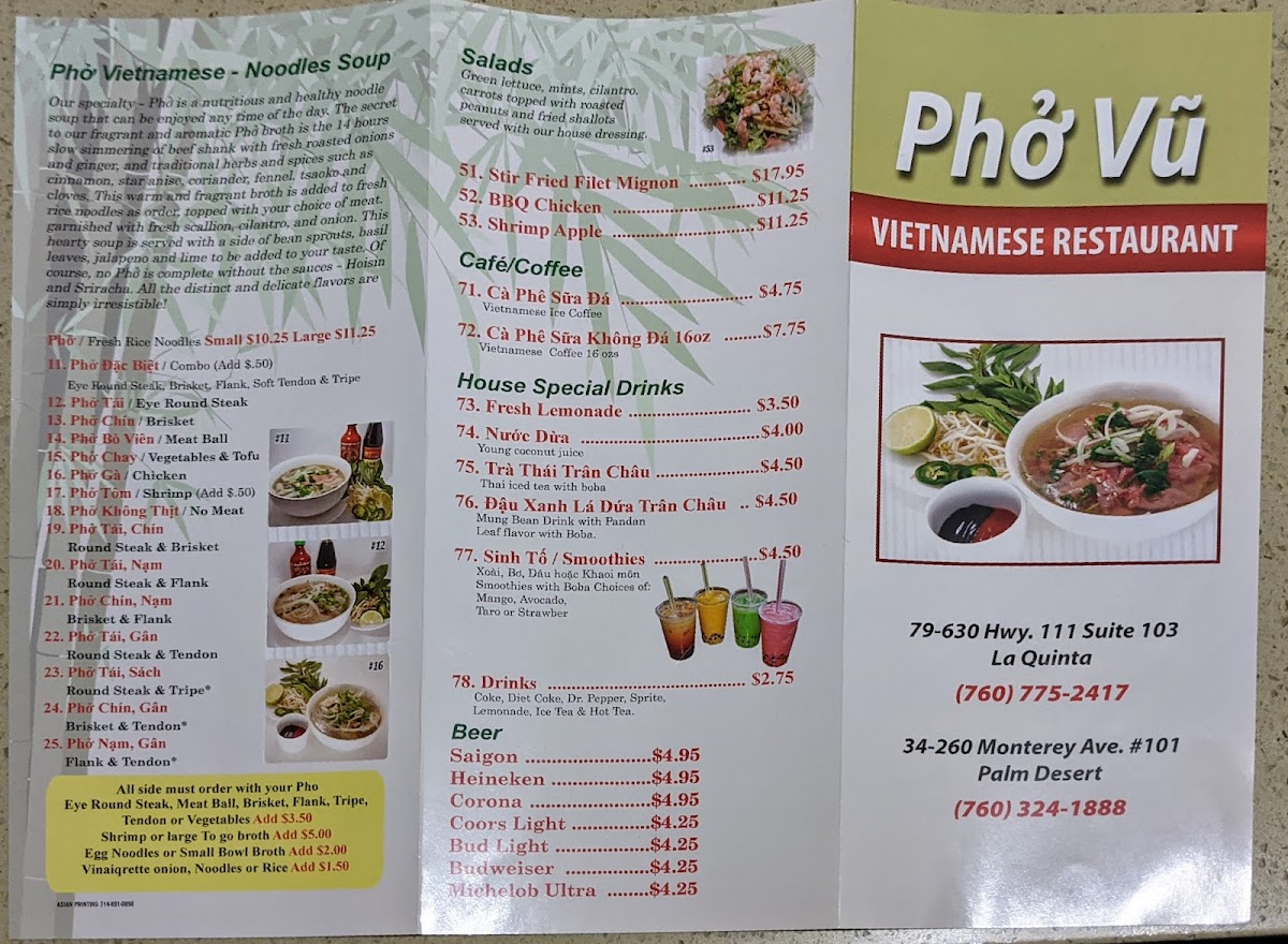Welcome to Pho Vu, a vibrant Vietnamese restaurant located in the heart of La Quinta, California. Nestled at 79630 CA-111 #103, this eatery specializes in delivering authentic flavors that transport you straight to Vietnam. The menu is a delightful mix of traditional dishes, highlighted by their renowned pho, which is praised for its rich, flavorful broth and generous portions.